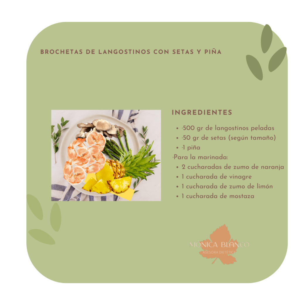 Cortamos la piña en dados y vamos montando las brochetas pinchando primero un trozo de piña, seguido de 1 langostino y una seta, de nuevo 1 trozo de piña, 1 langostino y una seta. Y así hasta 3 o 4 unidades de cada ingrediente. Llevamos las brochetas a la plancha para dorarlas por ambos lados, servimos en una fuente y listo.